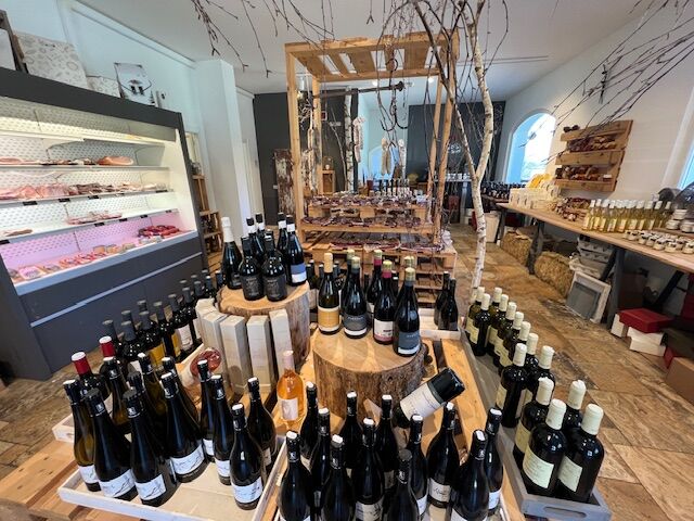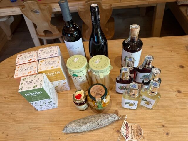 (写真下:山の中にある高級グルメショップ。到着して直ぐにお買い物しました。これは滞在中の分も含めて。ワインに、ハーブティー、ジャム、アスパラガスの酢漬け、ニンニクのピカンテオイル漬け、地元産のフルーツで作られたお酒、いつもオーナーのお父さんに頂く名物のルカニカソーセージ。 お土産は最終日に山ほど買いました )