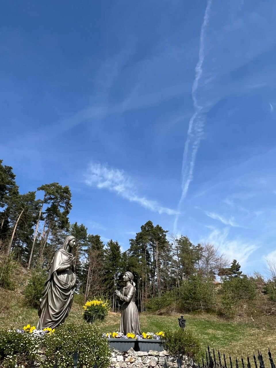 マリア様の後ろの青空に十字架のような雲が見えました✝️階段は、一段一段祈りを捧げながら膝で登り、キリスト様まで上がっていきます)