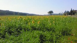 写真:郊外ではひまわりが沢山咲いていました。赤いお花はケシです。