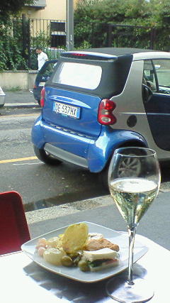 ミラノにはHappy hourと言う時間があります。これはドリンクが何時もの値段より安くなるのではなく、ちょっとした軽食が付いて来るのです。その軽食は全てビュッフェスタイルで、あなたのお好きなようにビックアップ可能。ピザあり、サンドウィッチあり、生ハムあり…。それはお店によります。